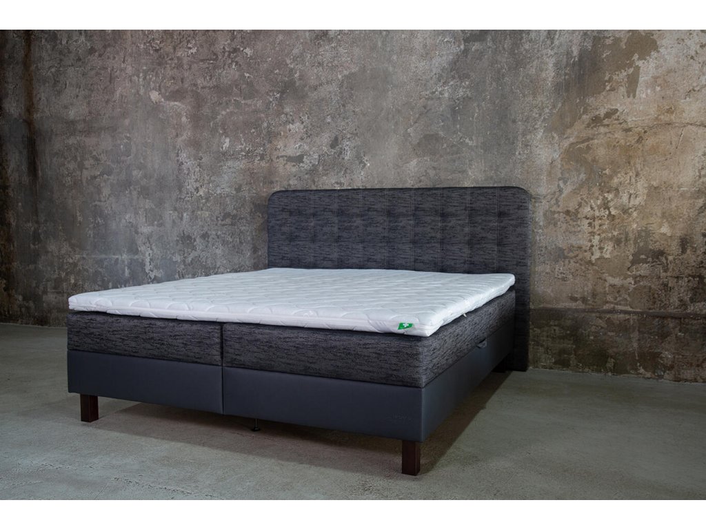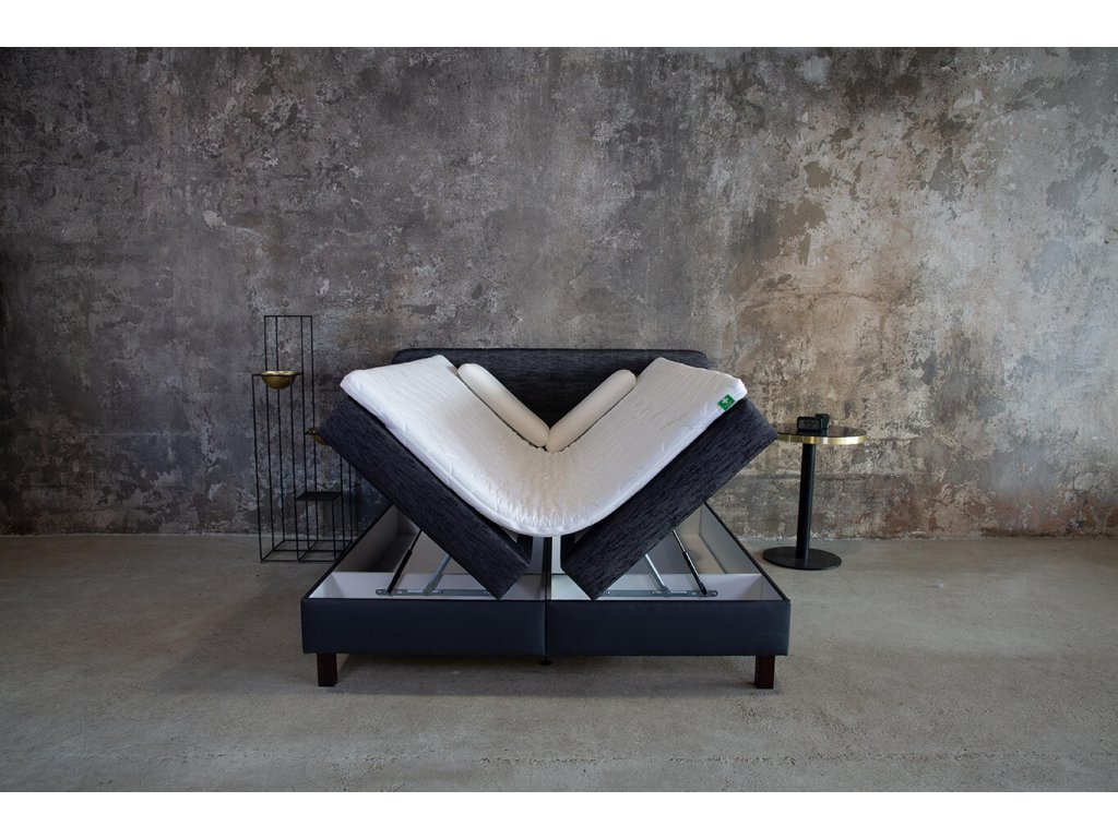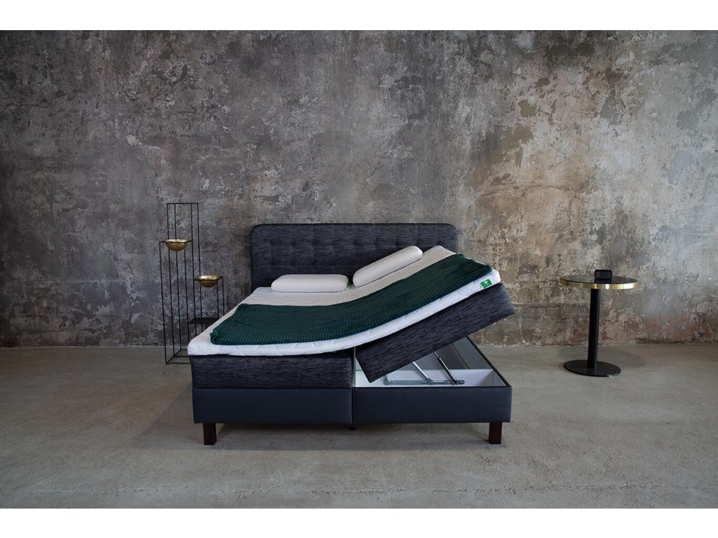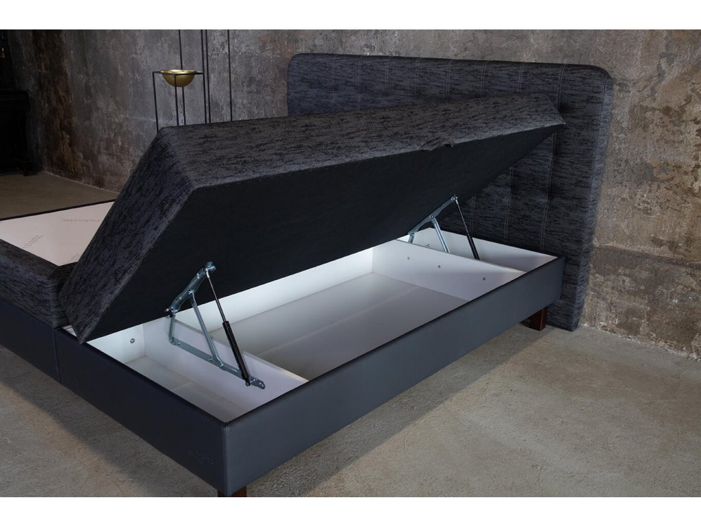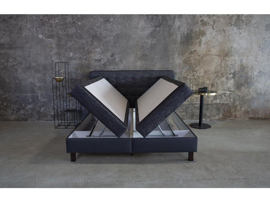 Čalouněná pevná základna typu „box“ s odvětranými úložnými prostory. Vašeho výběru. Úložné prostory jsou snadno přístupné díky vyklápěcím mechanismům s plyn-kapalinovými vzpěrami. Úložné prostory jsou odvětrané. Díky vysokým nožičkám (postel „neleží“ na zemi) je zachováno správné proudění vzduchu pod postelí. Nebudete tak vystaveni průvanu ani prachu.