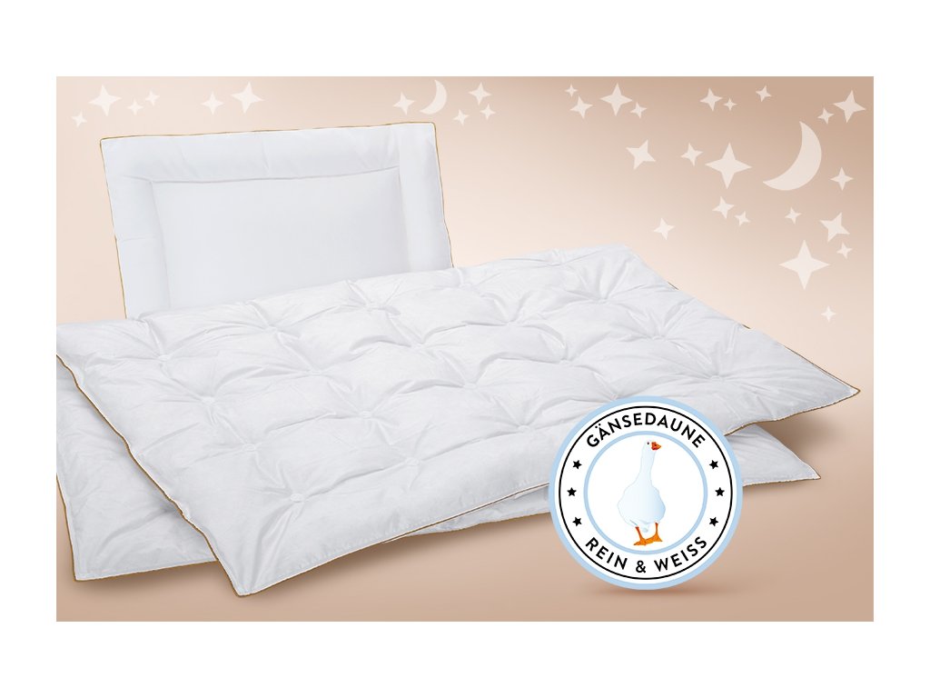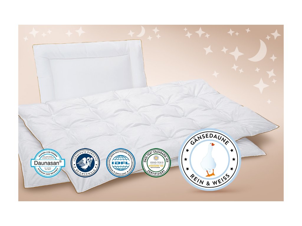 Povrchovou tkaninu přírodní dětského setu tvoří 100% jemná a prodyšná organická bavlna, která působí heboučkým dojmem. Peřinka i polštářek je naplněn pouze načechraným prachovým husím peřím třidy I. (původ Německo), tak aby tvořil ten nejvyšší komfort pro miminko, kterému se bude spinkat jako na obláčku. Celý obvod lemuje zlatá paspule, která jim dodává luxusní vzhled. 100% přírodní výrobek pro přirozený spánek. Set má celkem 6 certifikátu kvality: Nomite, Ökotex, Traumpass, Daunsan, IDFL, Tierchutz garantie Böhmerwald. Peřinku je možné vybírat ze dvou velikostí: 80x80 cm a 100x135 cm.