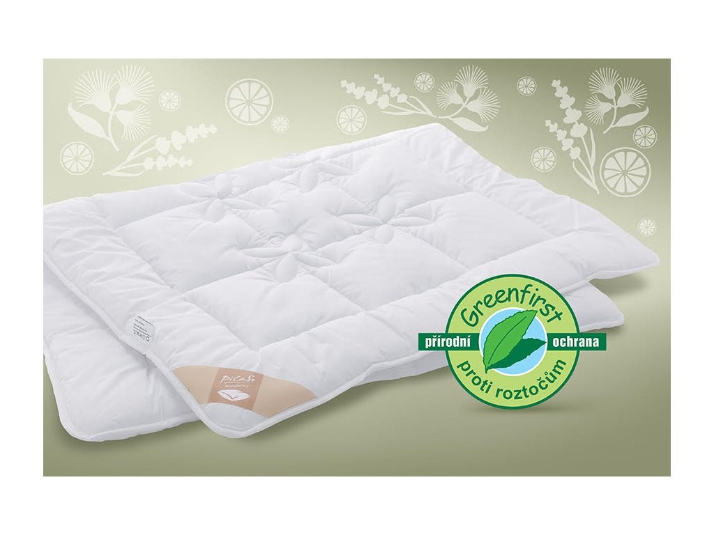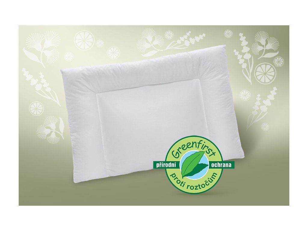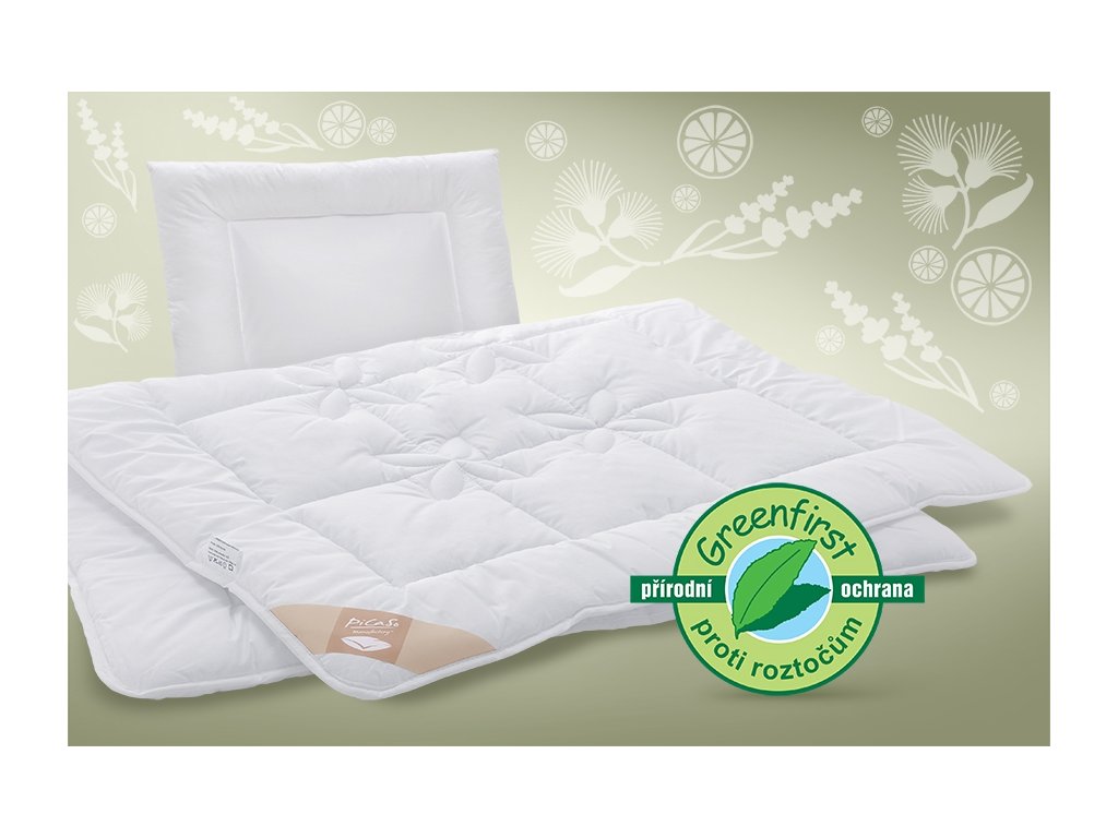 Povrchová tkanina dětského setu GREENFIRST je vyrobena ze 100% čisté ekologické patentované bavlny GREENFIRST®, která je opatřena nesepratelnou úpravou obsahující esenciální oleje z cintrónu, eukalyptu a levandule - bez parfemace. Tyto éterické oleje neobsahují tukové látky jako např. rostlinné oleje. Z nich vytvořený přírodní preparát je alergicky neutrální a dodává textiliím jedinečné vlastnosti pro ochranu proti prachovým roztočům, molům a komárům. Eukalyptové éterické oleje navíc příznivě působí na horní cesty dýchací a dodávají pocit uvolnění. Přírodní esenciální oleje zafixované v bavlněné tkanině působí blahodárně na povrch těla. Polštářek batole je vyplněn polyesterovými kuličkami a náplň přikrývky tvoří značková dutá vlákna FibreHCS, které jsou vysoce odolné vůči mikroorganismům. Výška polštáře je cca 6 cm.