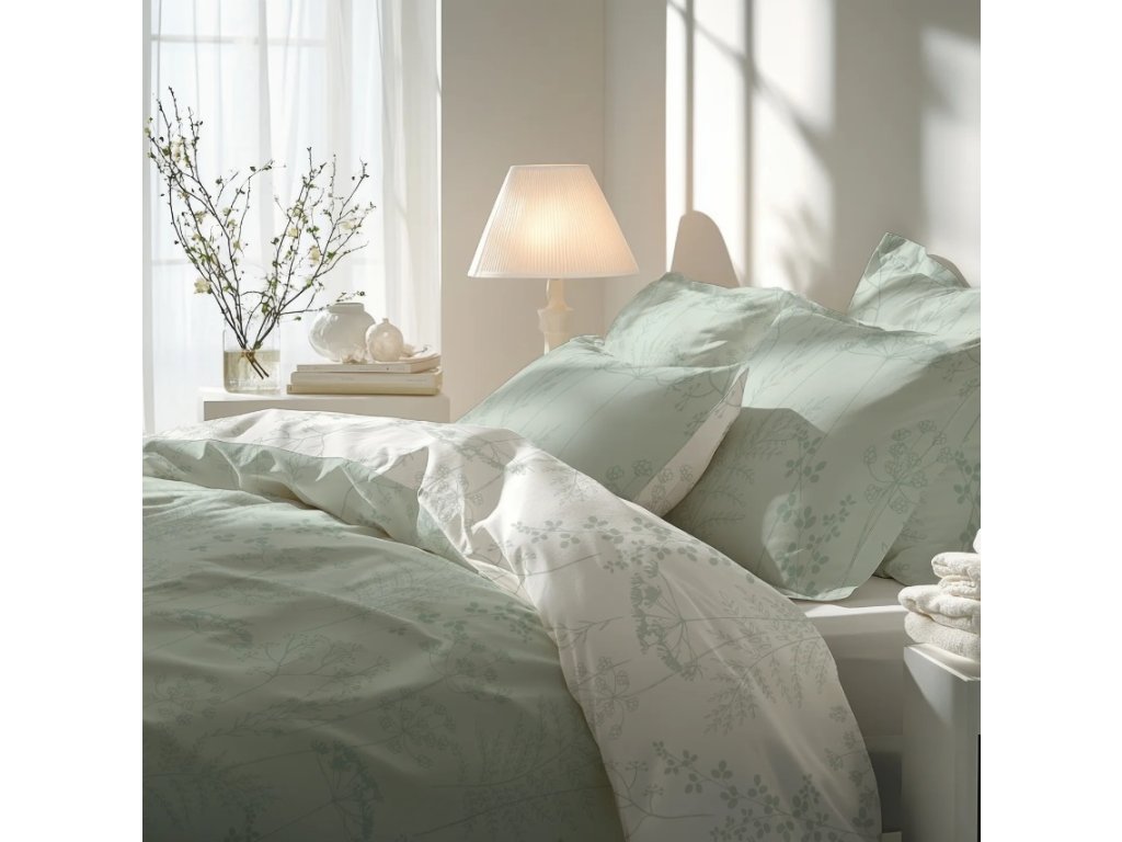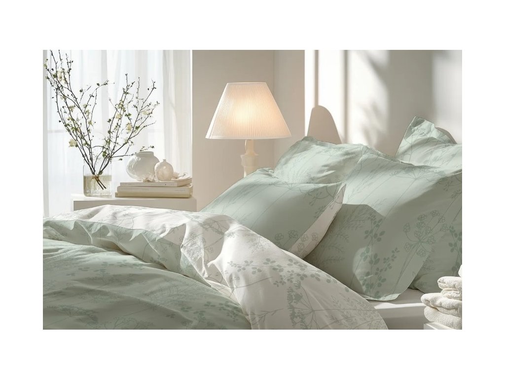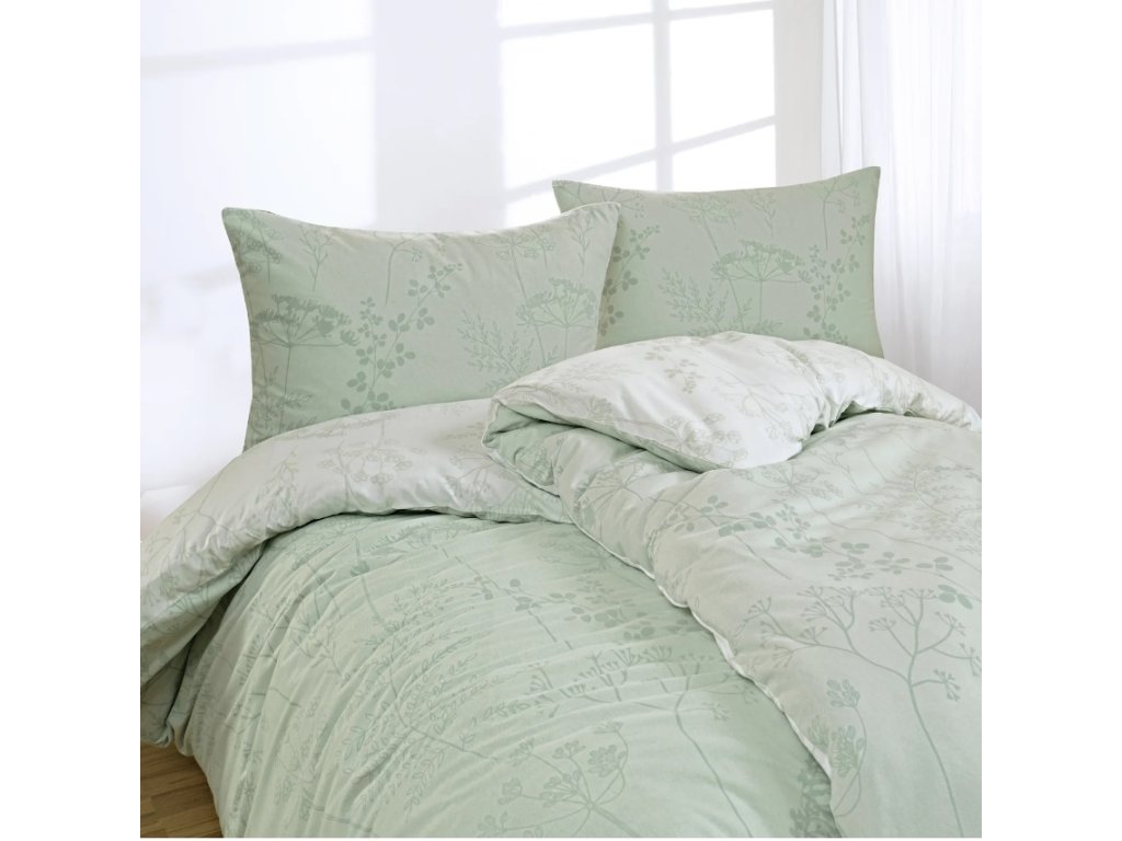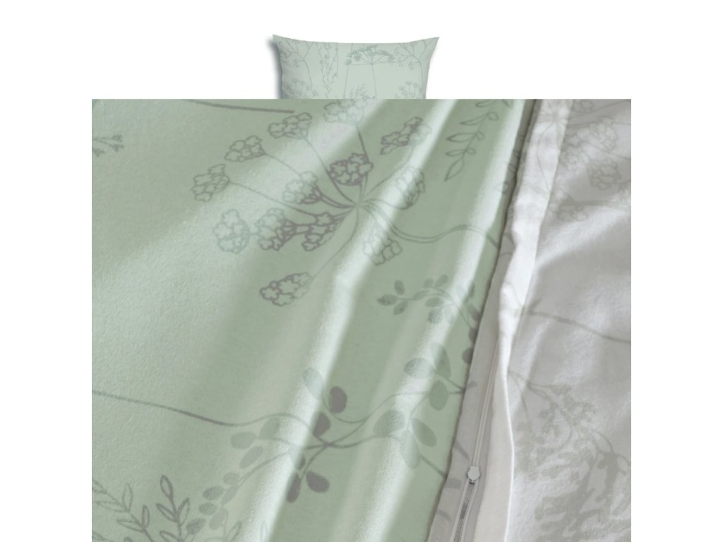Hra se stíny a obrácené zbarvení činí tento design obzvláště atraktivním. Znázornění kapradin, pupečníků a stonků, redukované na linie a kontury, působí jako otevřená kniha herbáře. Jemný stín na přední straně dodává designu živou hloubku, obrácená zadní strana je atraktivním vizuálním doplňkem, který dotváří sofistikovaný oboustranný design jako celek. Extrémně jemné zbarvení v kombinaci se zářivě bílou dělá tuto hru ještě elegantnější. Svěží zelená v této variantě připomíná jarní probuzení. Oba povlaky jsou na zip s robustním kovovým jezdcem.