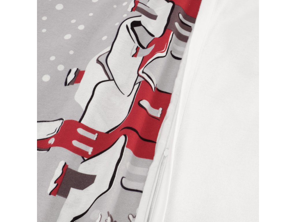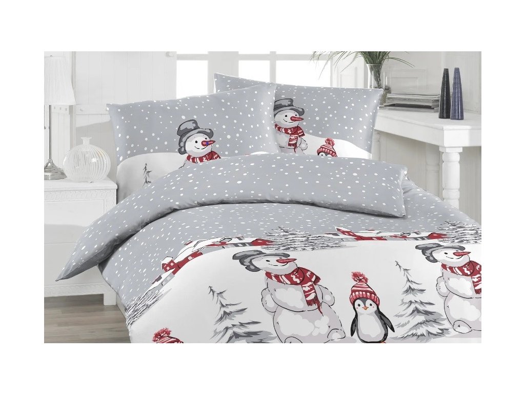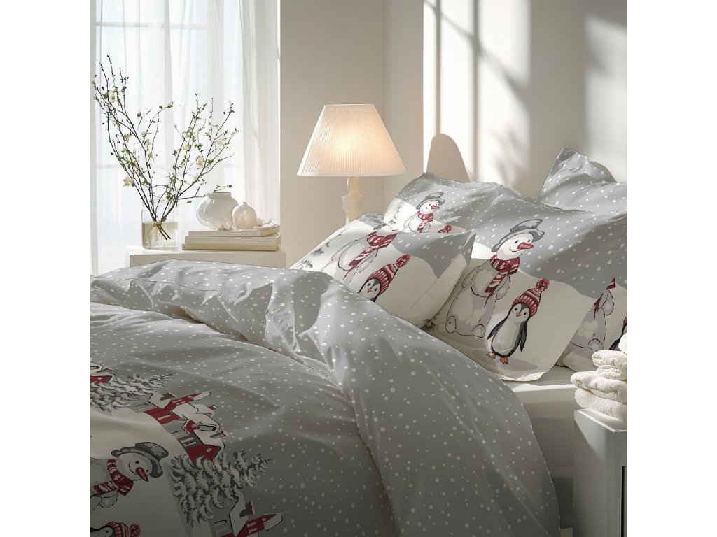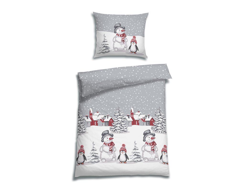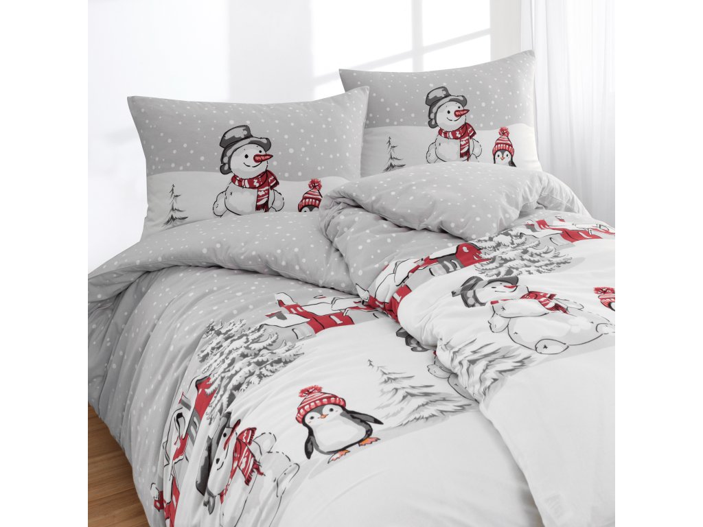 Toto povlečení vypráví malý zimní příběh – o dvou přátelích, kteří se dokonale doplňují. Sněhulák se svou okouzlující ošuntělou čepicí zasněně hledí do dálky, jako by už plánoval své další sněhové dobrodružství. Vedle něj stojí malý tučňák, drzý a plný energie, připravený na další sněhovou bitvu. Dvě postavy, které svým vlastním způsobem ztělesňují kouzlo zimy: jedna klidná a nápaditá, druhá živá a plná energie.