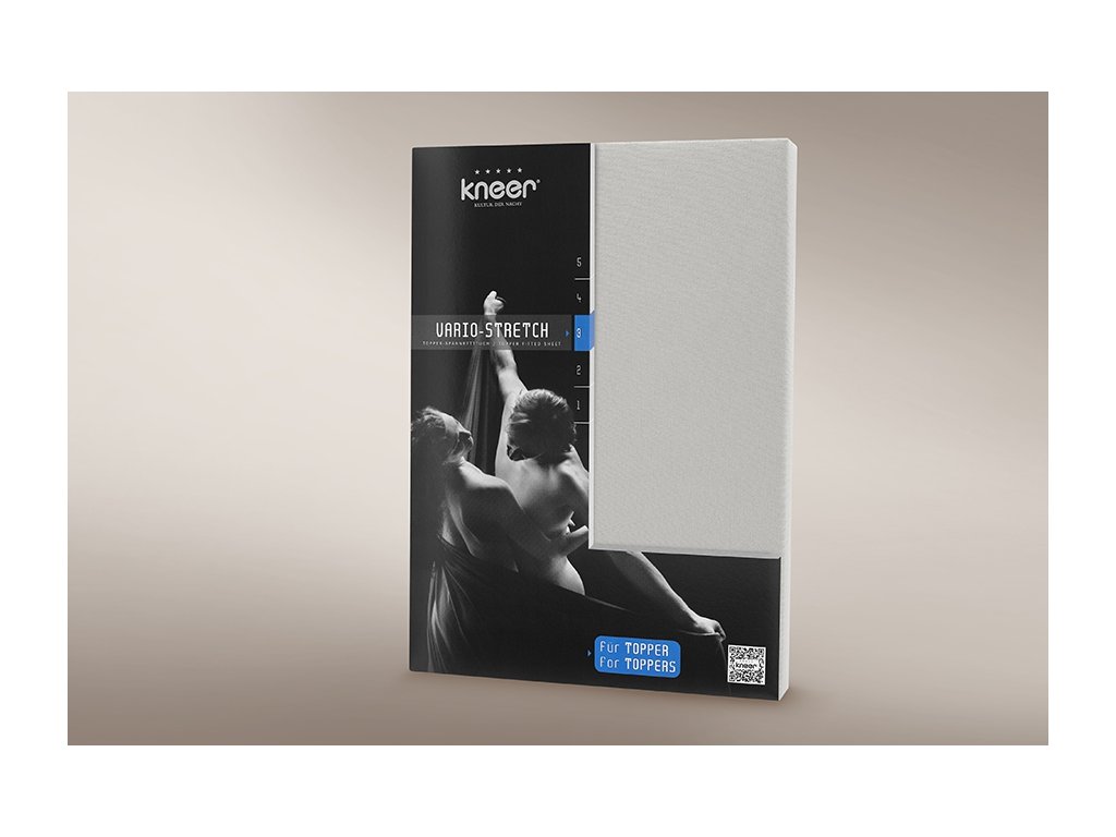 Tkanina prostěradla Vario Stretch od firmy Kneer o vysoké hmotnosti 190 g/m2 je navržena z bavlny Jersey 50% (měkká, elastická pletenina) 45% modalu (celulózové vlákno vyráběné převážně z bukového dřeva s vysokou přužností a pevností) a 5% elastanu, díky které prostěradlo krásně padne na topper až do výšky 12 cm. Prostěradlo je tvarově i barevně stálé i po mnohačetném praní. Podél celého obvodu je našita guma, díky které se prostěradlo pohodlně fixuje k podložce nebo topperu.