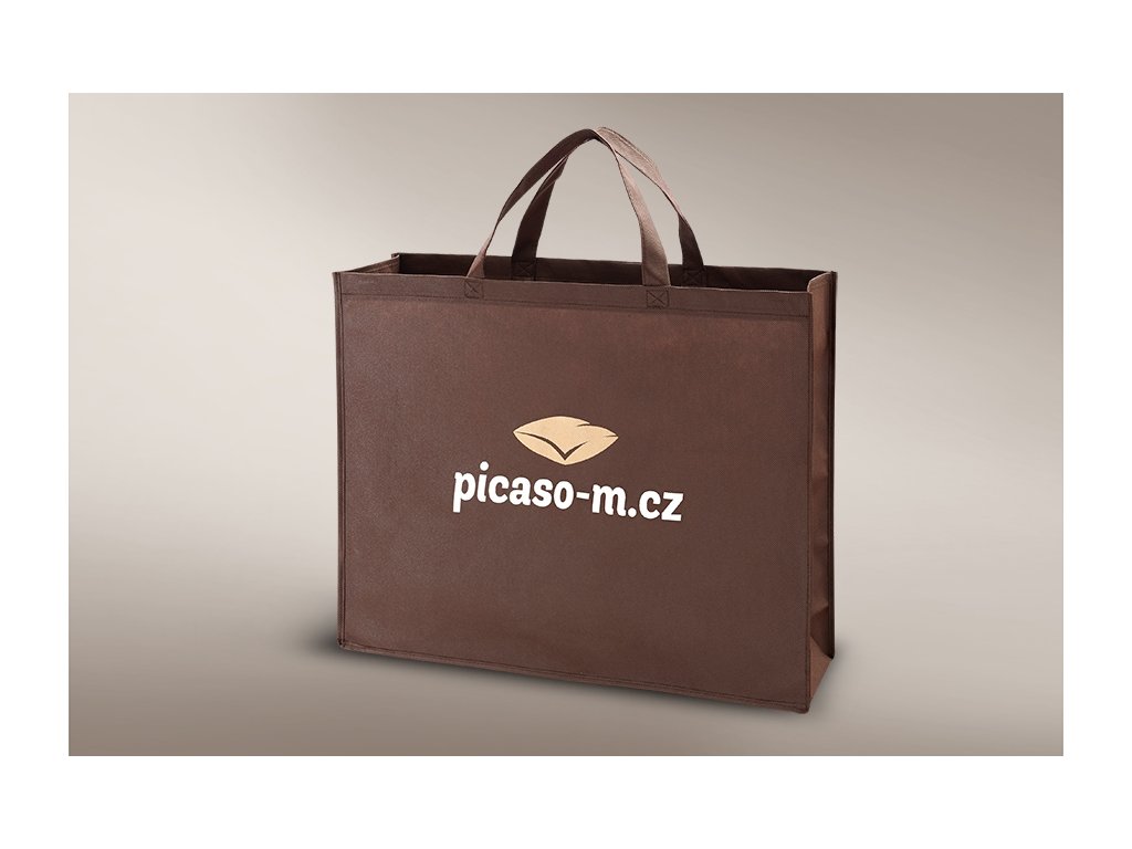 Rozměr tašky z netkané textílie: 37 cm výška x 45 cm šířka x 12 cm hloubka, Barva tmavě hnědá s logem PiCaSo. Nosnost do 20 kg. Vyrábí česká firma Rolsit - výrobce obalů a nákupních tašek s potiskem z netkané textílie a bavlny: www.rolsit.cz