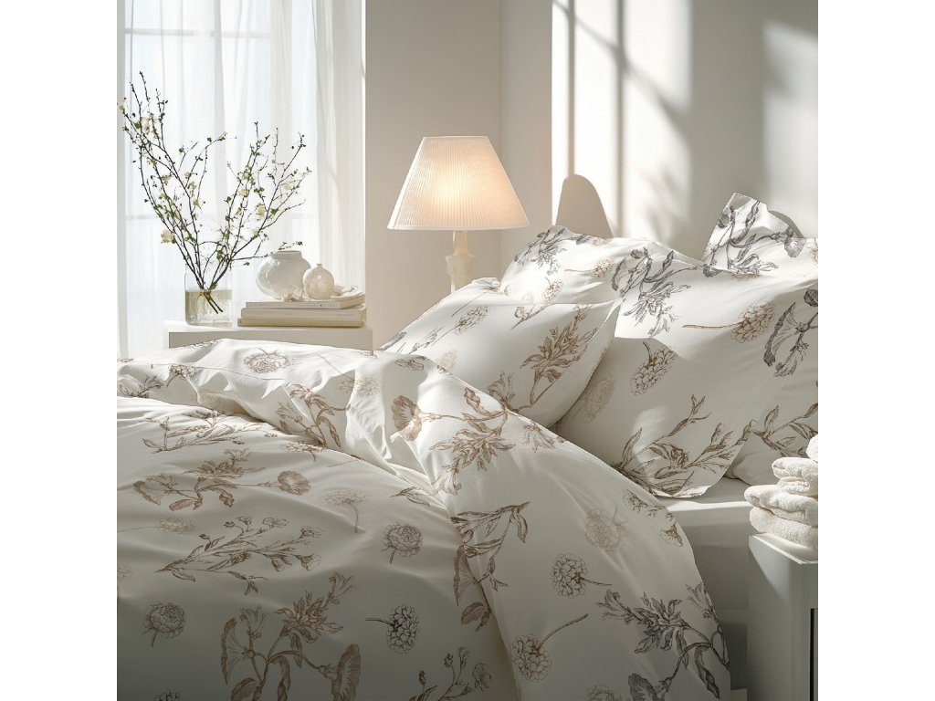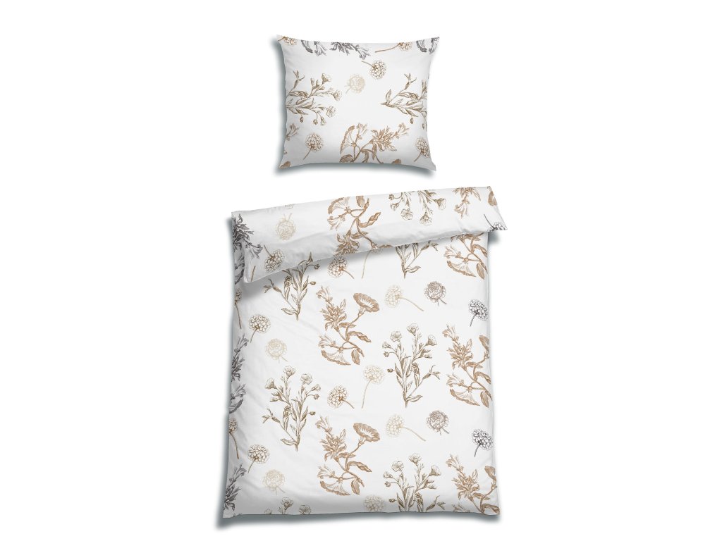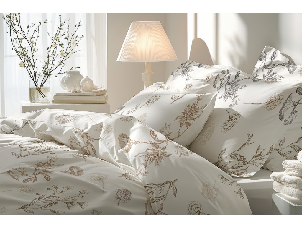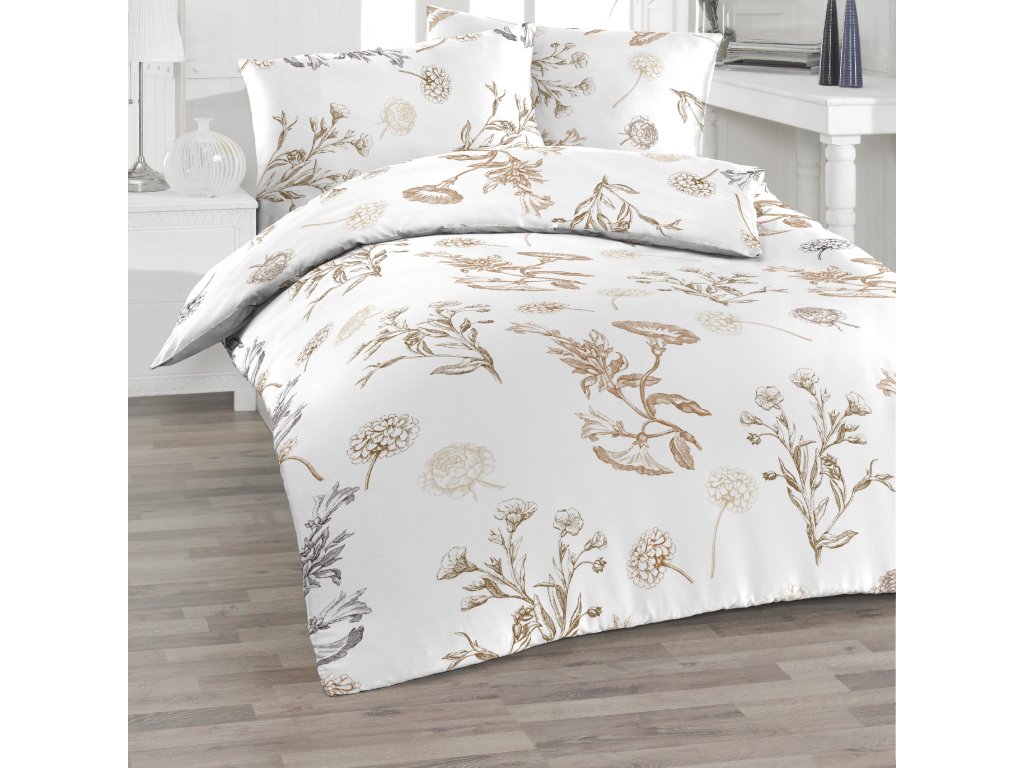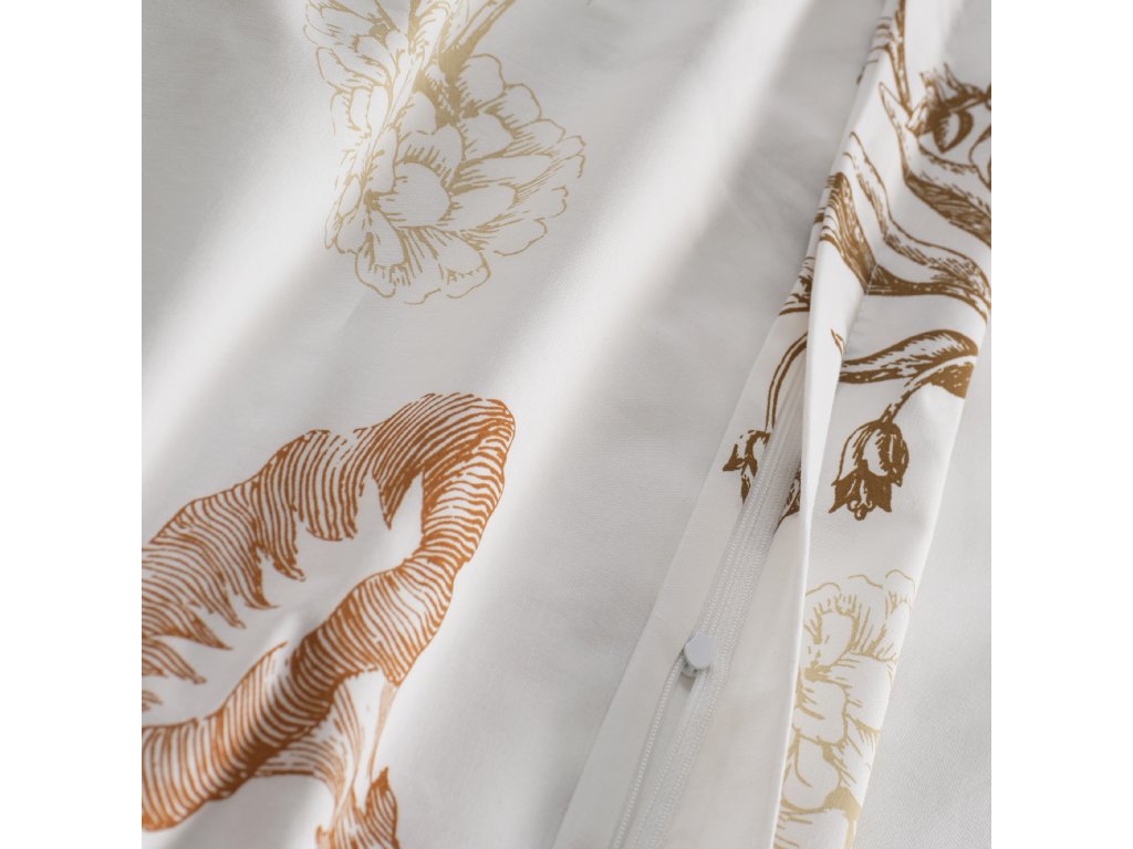 Květinové motivy v měděném stylu, v elegantních bronzových tónech a s různými výraznými liniemi, jsou příjemně náhodně rozmístěny na bílém pozadí. Bronzové tóny vytvářejí teplou a luxusní atmosféru, zatímco bílé pozadí jasně a stručně zvýrazňuje motivy. To dodává designu nadčasovou a sofistikovanou estetiku, která dokonale zapadá do nekonvenčního a kreativního bohostylu: harmonická kombinace elegance a ležérnosti. Bronzové tóny se bezproblémově prolínají se zemitými a přírodními barevnými paletami bohochic, zatímco květinové vzory dodávají hravý a romantický nádech. Jemná elegance, která vás zve k tomu, abyste se nechali okouzlit noc co noc a užili si uklidňující atmosféru.