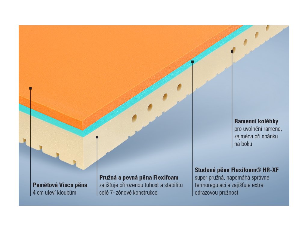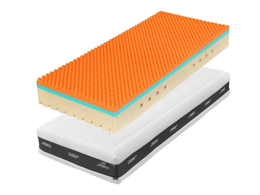 Vrchní oranžová paměťová pěna (tuhost 7/10) o výšce 4 cm pro lepší elasticitu a úlevu kloubům. Varianta Wellness s jemnou relaxační masážní profilací.