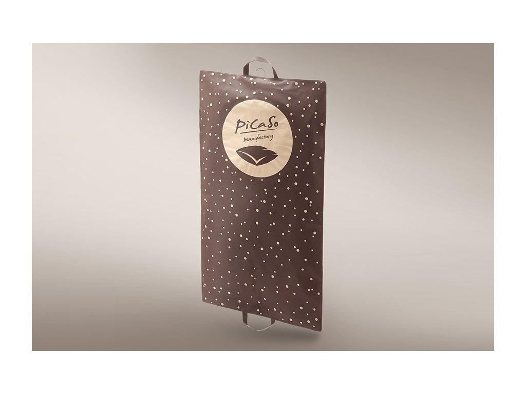 Rozměr vaku z hnědé netkané textílie je 110x60 cm nebo 170x60 cm. Barva čokolodává s béžovým potiskem a logem PiCaSo. Nahoře mezera na ramínko. Zapnínání na zip uprostřed vaku. Vyrábí česká firma Rolsit - výrobce obalů a nákupních tašek s potiskem: www.rolsit.cz