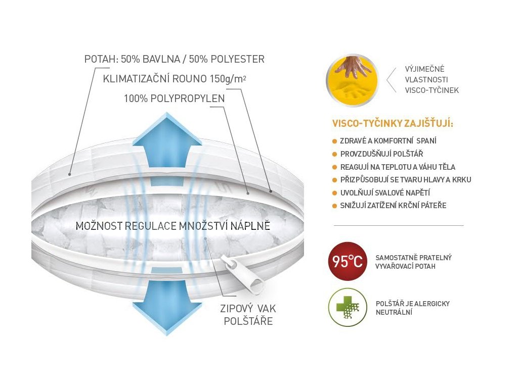 - Náplň polštáře tvoří unikátní bílé visco (paměťové) tyčinky, které plní funkci ergonomického zdravotního polštáře a zaručí tak vysoký komfort během spánku. VISCO-tyčinky zároveň polštář provzdušňují.